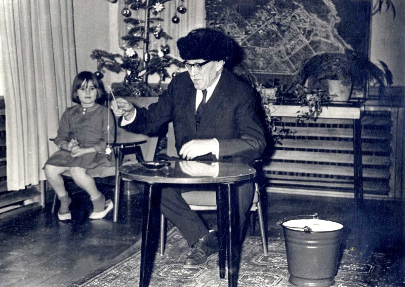 М.А. Лаврентьев изображает "шараду" для ребёнка.
