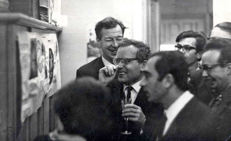 Празднование в отделе программирования избрания А.П. Ершова членом-корреспондентом АН СССР. Все рассматривают газету, выпущенную по этому случаю. Стоят слева направо: А.Ф. Рар, А.П. Ершов, Г.И. Кожухин, В.Е. Котов