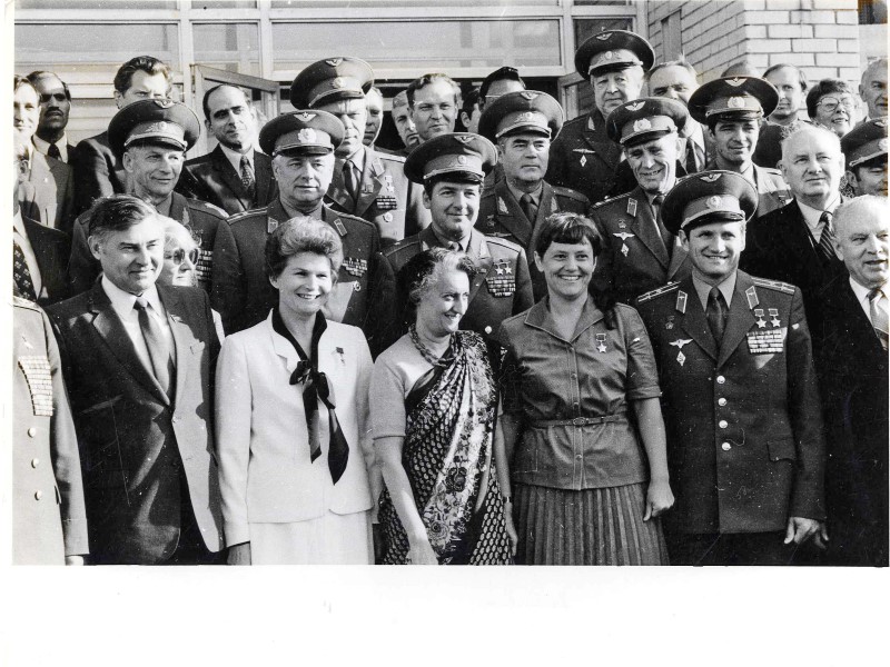 Индира Ганди в Центре космонавтики ("Звёздный городок"). В первом ряду слева направо: Г.И. Марчук, В.В. Терешкова, И. Ганди, С.Е Савицкая, Б.В. Волынов.