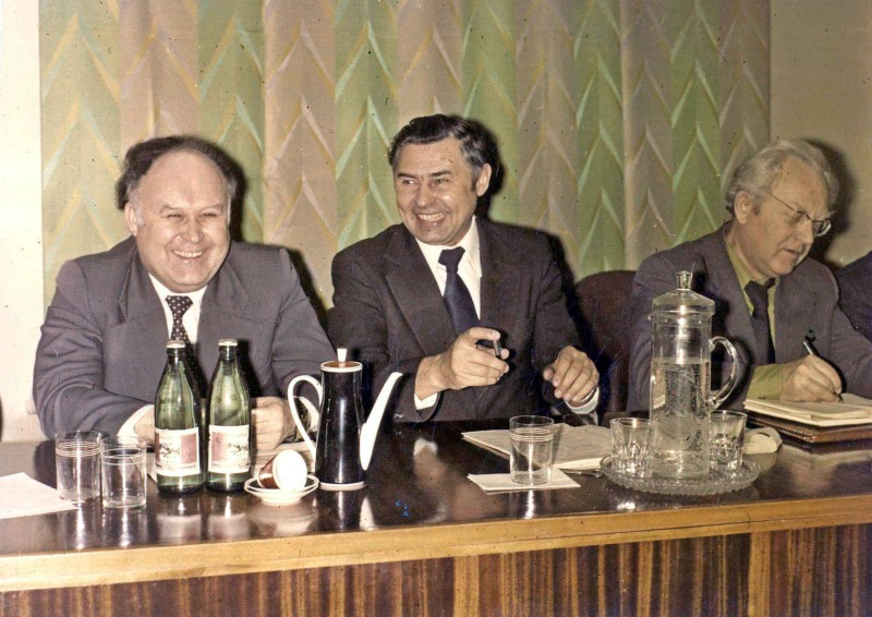 Совещание по взаимодействию СО АН СССР с заводом п/я 80. Слева направо: директор завода Э.Н. Свечников, Г.И. Марчук, М.Ф. Жуков.