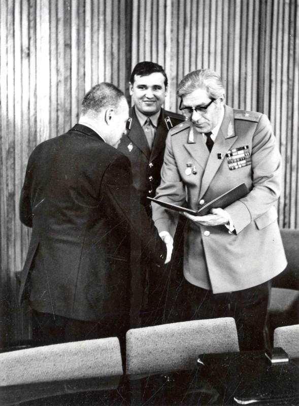 Начальник милиции г. Новосибирска вручает поздравительный адрес А.А. Трофимуку.