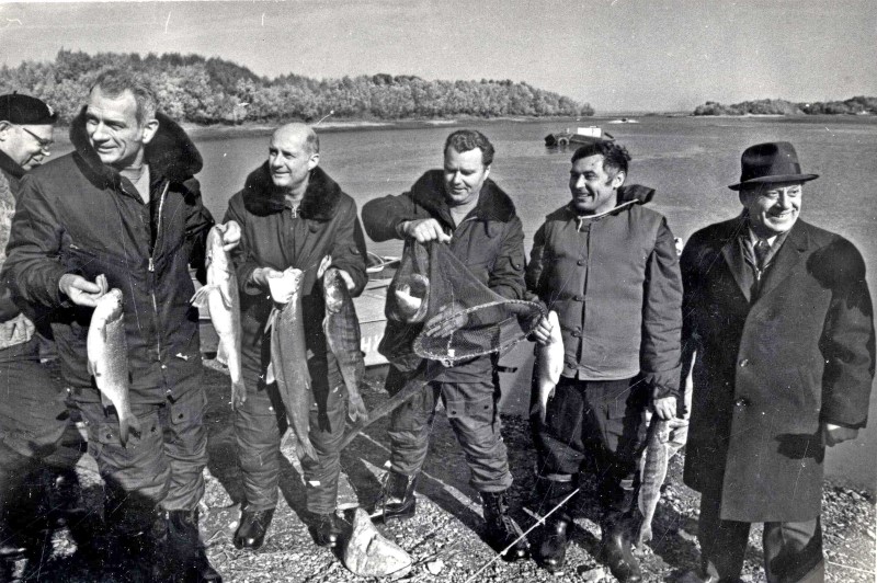 Делегация "Союз-Аполлон" в Новосибирском Академгородке. На рыбалке. Слева направо: Д. Слейтон, Т. Стаффорд, В.А. Шаталов и академик Г.И. Марчук.