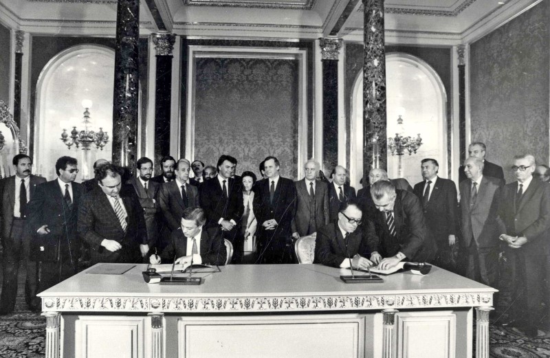 Визит в СССР Председателя правительства Испании Гонсалеса с супругой. На фото - подписание какого-то договора. Филиппе Гонсалес сидит слева. В официальной делегации СССР Г.И. Марчук (4-й справа), Э.А. Шеварнадзе, Н.И. Рыжков (7 и 8 справа). |