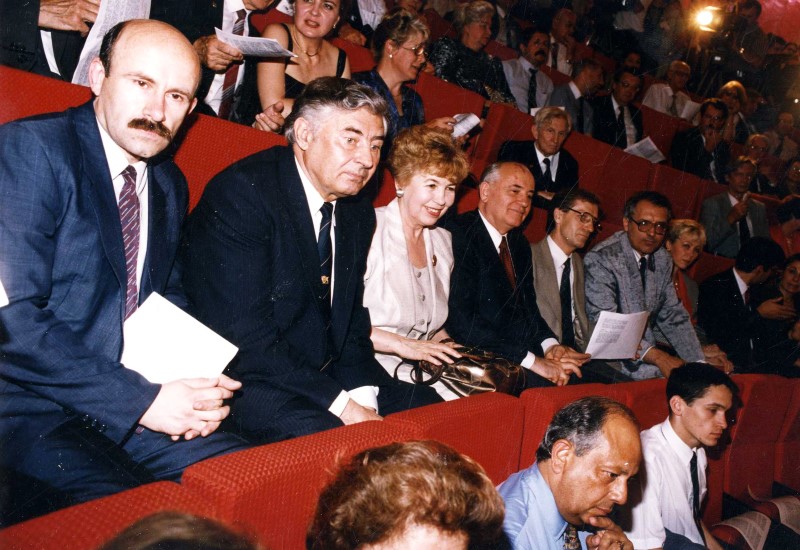 Церемония присуждения баронессе Маргарет Тэтчер звания Почётного доктора Менделеевского университета. Сидят слева направо: телохранитель М.С. Горбачёва, Г.И. Марчук, Р.М. Горбачёва, М.С. Горбачёв.