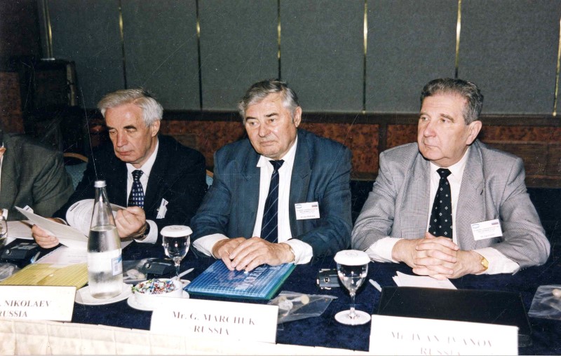 Члены российской делегации на международной конференции геофизиков в Берлине, посвящённой памяти И.А. Кибеля. Слева направо: член-корреспондент РАН А.В. Николаев, академик Г.И. Марчук, академик И.Д. Иванов