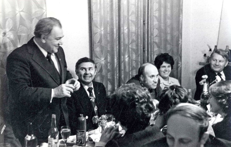 Гости на юбилее А.С. Алексеева. Слева стоит юбиляр - А.С. Алексеев, затем сидят Г.И. Марчук, М.М. Лаврентьев, -, Е.И. Шемякин