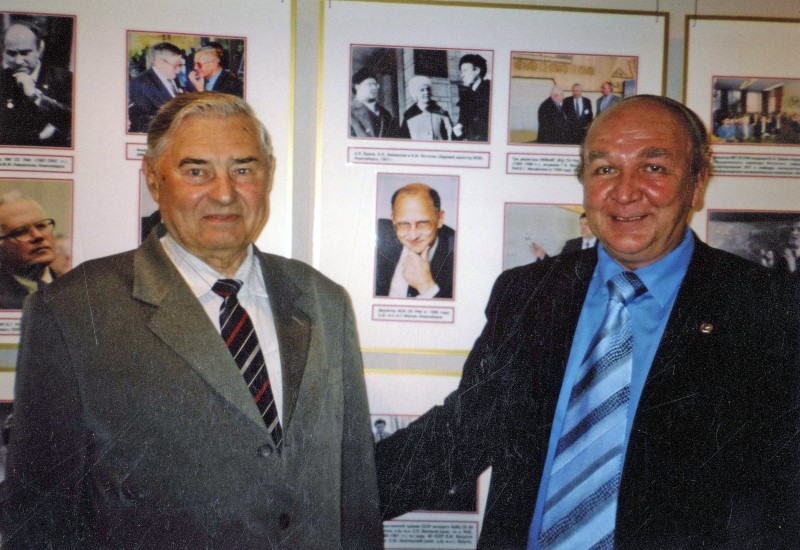 Г.И. Марчук (слева) и Б.Г. Михайленко на праздновании 50-летия Академгородка. Они стоят на фоне стенда с фотографией А.Г. Марчука.
