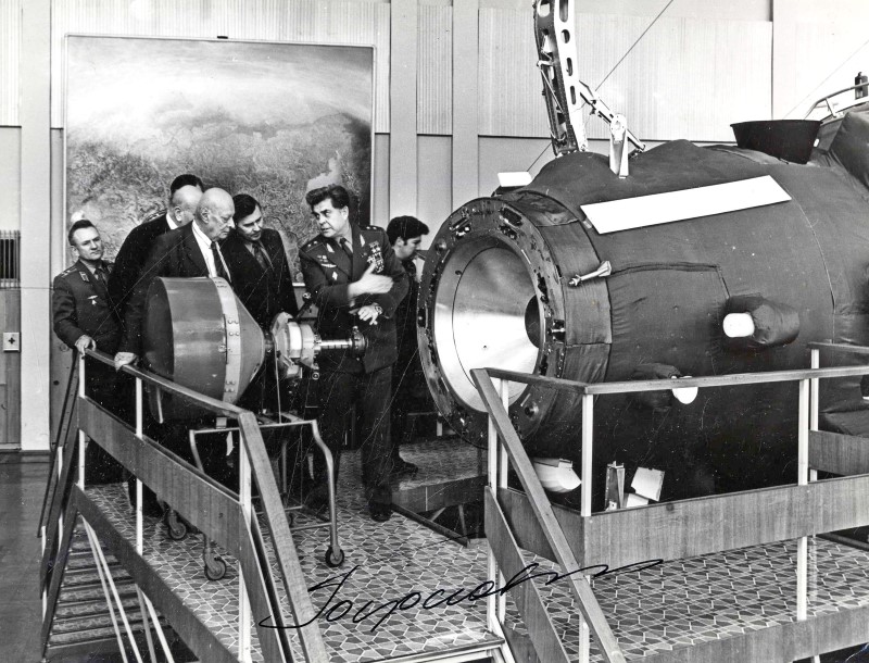 В центре подготовки космонавтов. Г.Т. Береговой демонстрирует космический аппарат А.П. Александрову и Г.И. Марчуку.