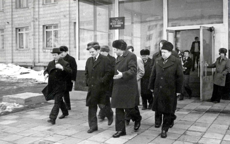 У. Пальме (в центре), Г.И. Марчук и другие члены делегазии выходят из Института геологии СО АН СССР.