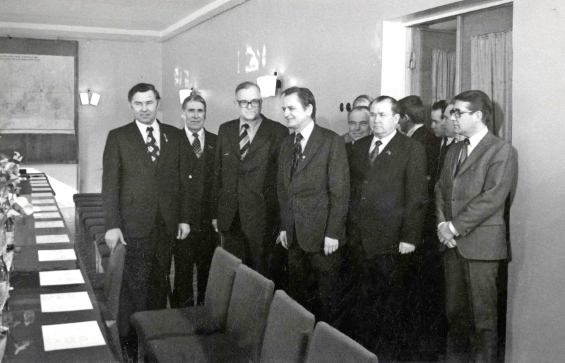 В зале приёмов Президиума СО АН СССР. Стоят слева направо: Г.И. Марчук, А.П. Филатов, В.А. Кириллин, У. Пальме, А.А. Трофимук.