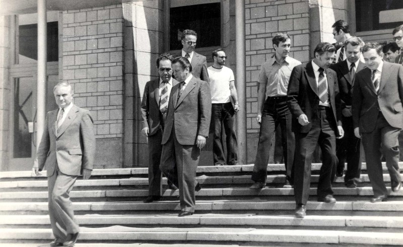 На ступенях Института ядерной физики. Г.И. Марчук (третий справа) сопровождает болгарскую делегацию. Рядом с ним - А.Н. Скринский. Слева - А.П. Филатов.
