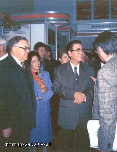 В выставочном центре СО РАН. Председатель Постоянного комитета Всекитайского собрания народных представителей Ли Пэн. Слева направо: Н.Л. Добрецов, -, Ли Пэн.