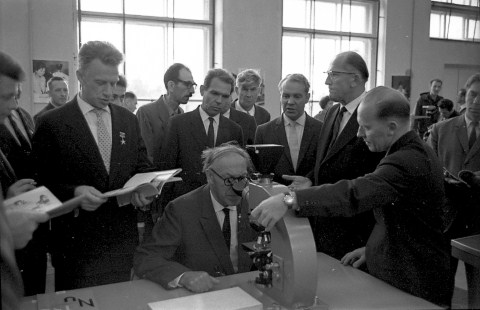 1963авг, Новосибирск На выставке "Карл Цейс", Германия. Слева стоит С.Л. Соболев, сидит М.А. Лаврентьев. Автор: Ахмеров Рашид Ибрагимович Архив: Фотоархив СО РАН, Источник: Архив Р.И. Ахмерова (негативы) | ||||||||||||