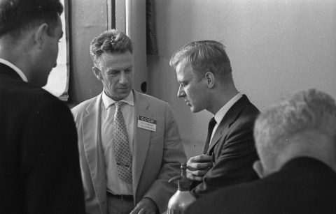 1963авг, Новосибирск Академик С.Л. Соболев (2-й слева), Ю.К. Мозер на советско-американском симпозиуме по дифференциальным уравнениям с частными производными. Автор: Ахмеров Рашид Ибрагимович Архив: Фотоархив СО РАН, Источник: Архив Р.И. Ахмерова (негативы) | ||||||||||||