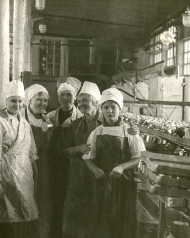 Студенческий отряд НГУ на острове Шикотан. Студентки в цехе по укладке сайры. Справа - Л. Кудрина. (Фото из коллекции И.Ю. Павловской).