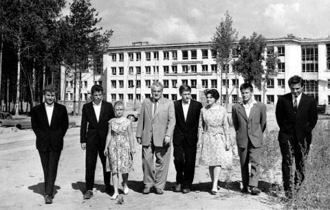 Первый ректор НГУ И.Н.Векуа со студентами. Слева направо: -, -, М.В.Киселева, И.Н.Векуа, В.А.Парфенов, О.И. Иванова, Ю.Л.Ершов, В.Р.Портнов.