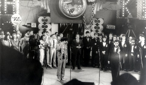 1/4 финала КВН. НГУ-ЛГМИ. У микрофона М. Сафаров (слева).
