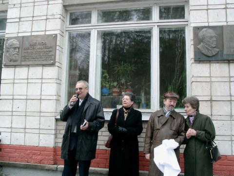 Открытие мемориальной доски на здании Физматшколы по адресу: г.Новосибирск, ул. Ляпунова, 3. Выступает А.А. Никитин, далее стоят Е.А. Ляпунова, Г.Ш. Фридман, Н.А. Ляпунова.