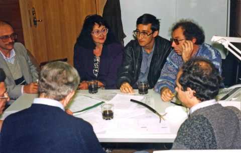 Обсуждение работы по проекту во время визита в Академгородок представителей фонда Сороса. Сидят слева направо: А.М. Федотов, Н.Г. Щербакова, С.П. Ковалев, С.Л. Мушер. Спиной - Ж. Садовский и И. Мафтер.