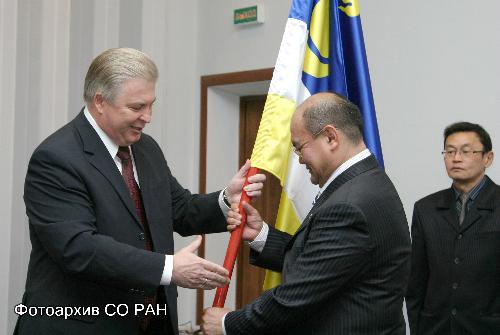 Торжественное собрание, посвященное 50-летию академической науки в Бурятии. Глава республики В.В. Наговицын подарил БНЦ символы власти - герб и флаг Бурятии, отметив, что "50-летие - это настоящий юбилей".