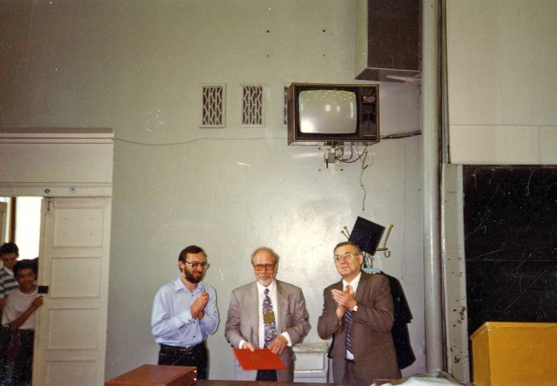 Н. Вирт (в центре) собирается читать лекцию в рамках Международной конференции "Перспективы систем информатики". Слева - А.Е. Недоря.