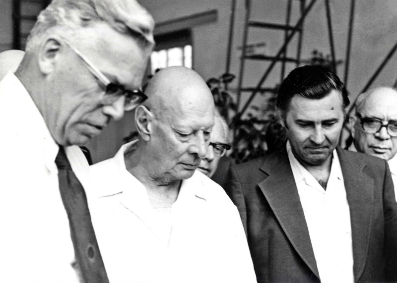 Президент АН СССР А.П. Александров (в центре) и Г.И. Марчук (справа) во время посещения Новосибирского авиационного завода им. Чкалова. Слева стои директор завода Г.А. Ванаг.