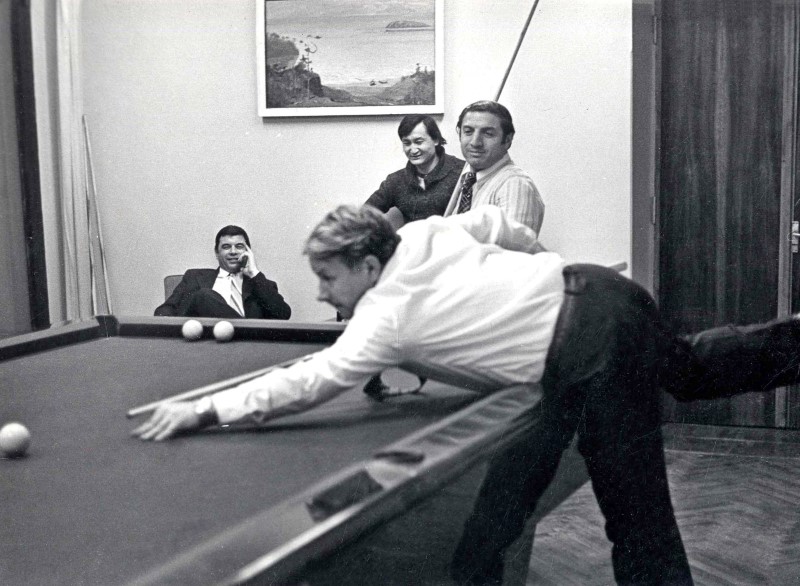 На отдыхе в командировке в Якутске. Е.И. Шемякин бьёт шар на билиарде.