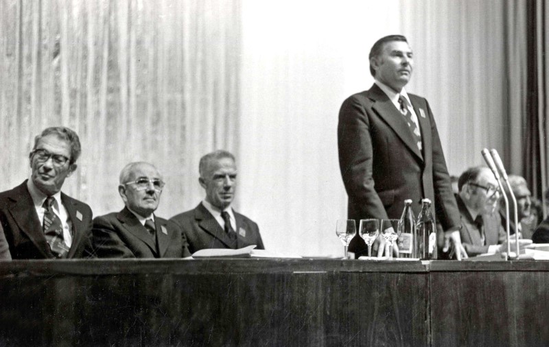 Торжественное заседание в честь 70-летия академика С.Л. Соболева. Сидят слева направо: Французский профессор Л. Шварц, форанцузский профессор Ж. Лёре, С.Л. Соболев, Г.И. Марчук, Л.В. Канторович.