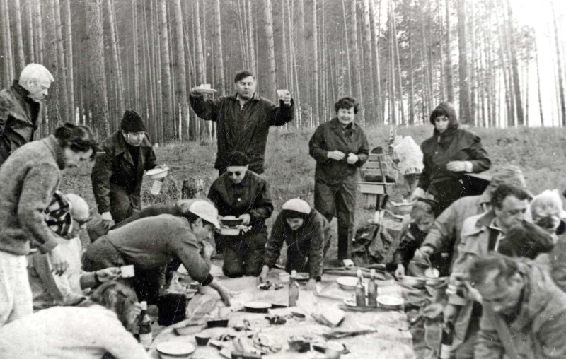 Традиционная уха в окрестностях Академгродка. Г.И. и О.Н. Марчук стоят в центре. Слева виден Л.В. Овсянников. Перед Гурием Ивановичем сидит М.К. Фаге. Справа сидят И.А Лавров и Л.Я. Савельев.