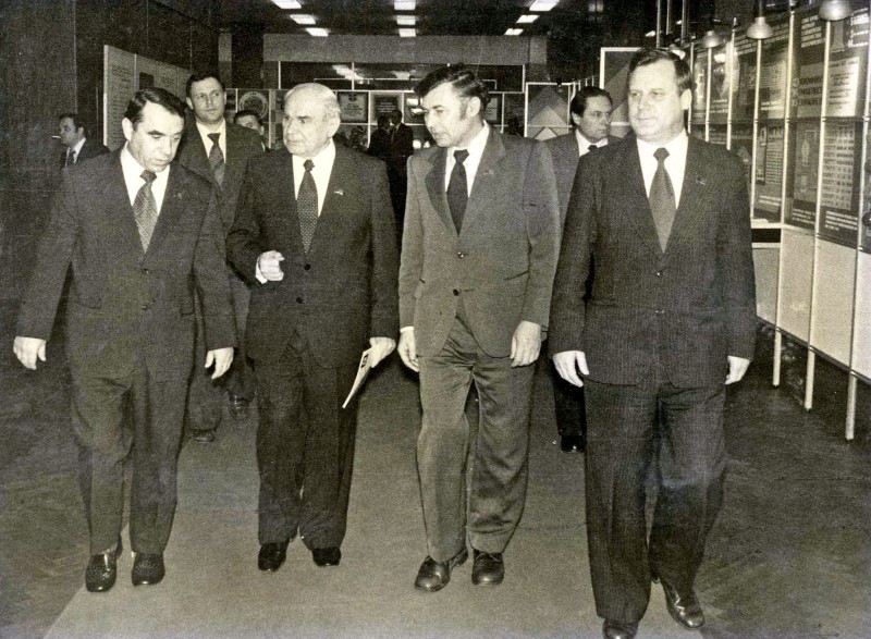 Руководитель Госплана СССР осматривает выставку работ СО АН СССР. Идут слева направо: -, Н.К. Байбаков, Г.И. Марчук, Н.И. Рыжков.