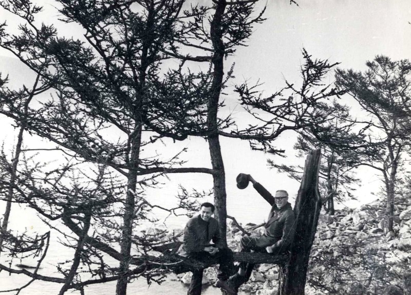 Г.И. Марчук с М.А. Лаврентьевым на дереве, смотрят сверху на АКадемгородок.