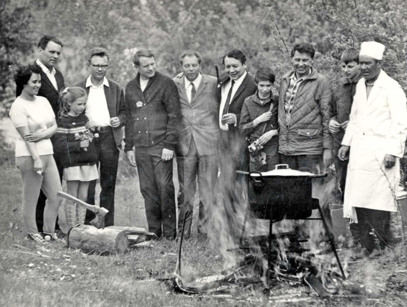 Хозяева готовят уху дла гостей Академгородка - летчиков-космонавтов СССР К.П. Феоктистова и Г.Т. Берегового и американского астронавт Н. Армстронга.