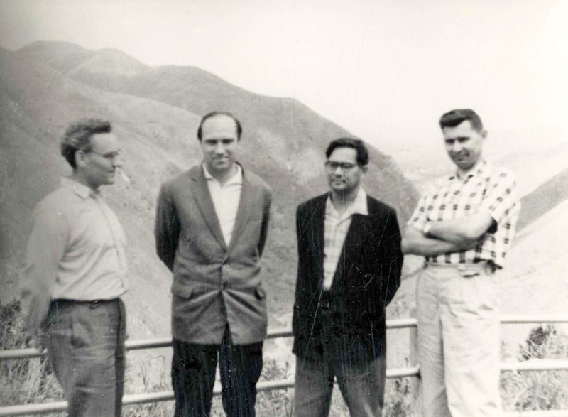 М.А. Лаврентьев (второй слева) и Г.И. Марчук (справа) на площадке высокогорного спортивного комплекса Медео.