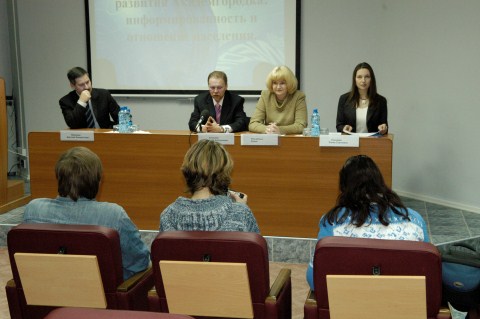 Все... (6) | Пресс-конференция посвященная анализу результатов проведенного в конце прошлого года социологического опроса жителей Академгородка об их отношении к существующим проектам его развития и, в частности, к созданию технопарка. В президиуме слева направо: Д. Б. Верховод, А. А. Алексеев, Е. В. Кузьминых, Е. С. Гвоздева. |