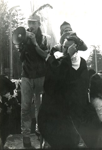 Карнавальное шествие. На первом плане - ректор НГУ С.Т.Беляев. Сзади ведущие: К.Скобеев, А.Хуторецкий. (Фото из коллекции А. Б. Хуторецкого).