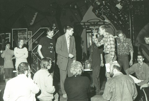 Генеральная репетиция команды НГУ в Москве. Слева направо: Л. Рябоконева, Ю. Соловьянова, В. Дуда, А. Филюрин, Д. Ловейко, И. Шаров, Л. Коновалов, В. Руднев.