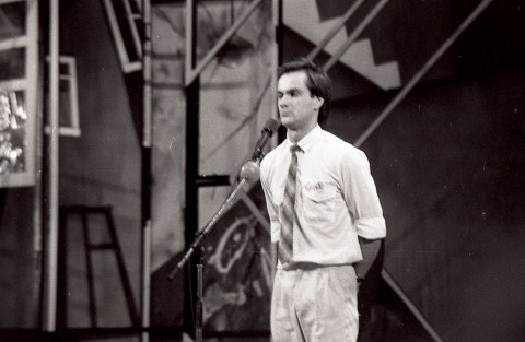 Команда КВН НГУ на сцене. У микрофона С. Кобцев.