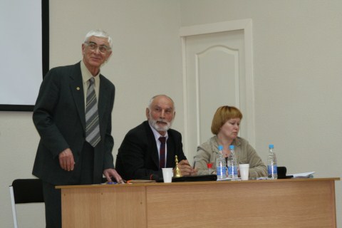 Комиссия на конференции по выборам ректора НГУ. Стоит - В.М. Титов, правее - Г.М. Мкртчян.