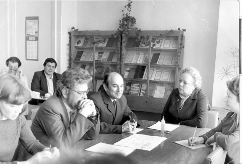 Заседание социологической группы Института экономики СО АН СССР. Во главе стола - Т.И. Заславская. Слева -А.М. Алексеев и Д.М. Казакевич.