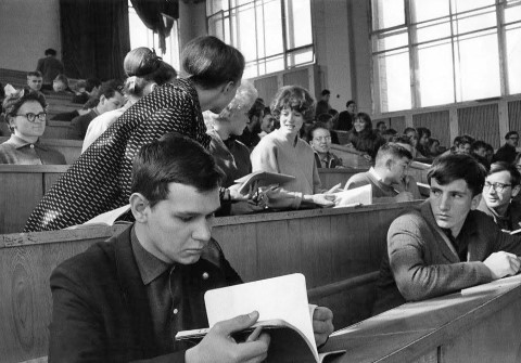 Студенты НГУ в лекционной аудитории. В центре - С. Трескова.
