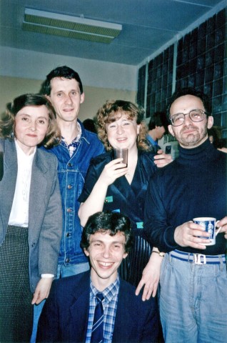 Сотрудники ИСИ СО РАН на праздновании пятилетия института. Стоят слева направо: Т.Г. Чурина, В.А. Цикоза, М.А. Елохина,С.Я. Гринберг. Сидит М.А. Бульонков.