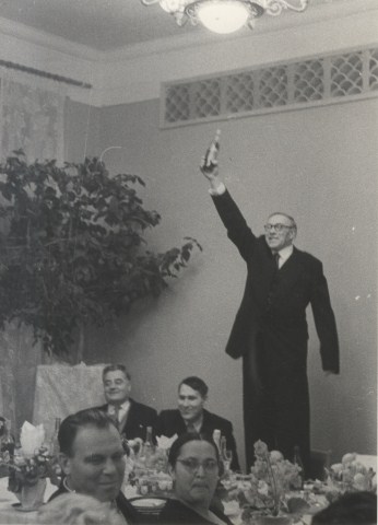 1960, Новосибирск Празднование 60-летия академика М.А. Лаврентьева. В центре стоит юбиляр с бутылкой шампанского в высоко поднятой руке. Автор: Притвиц Наталья Алексеевна Архив: Фотоархив СО РАН, Источник: Архив М.А. Лаврентьева из ИГиЛ | ||||||||||||