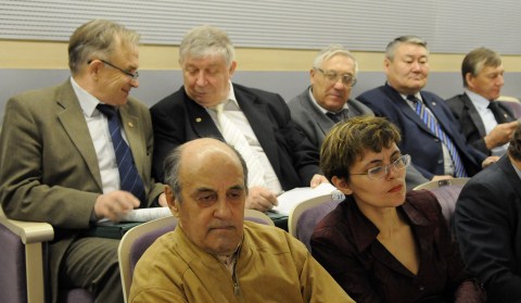 На Общем собрании СО РАН. На первом плане - В. Л. Соскин.