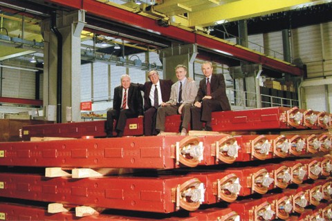 366 магнитов изготовлены в ИЯФ СО РАН и поставлены в ЦЕРН для проекта Большого Адронного Коллайдера (БАК). Слева направо: Л. Майани, А.Н. Скринский, Л. Эванс.