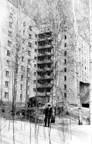 Общежитие НГУ №8/2 ранней весной. На переднем плане Максим Макаров.