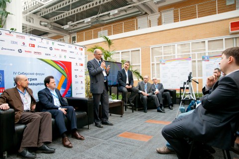 2011апр14, Новосибирск Участники панельной дискуссии "Институты развития и инноваторы: есть контакт?". Слева направо: Н.В. Комлев, А.В. Лысковский, А.Г. Марчук, Д.Б. Верховод. Автор: Зырянов Алексей Петрович Архив: Фотоархив СО РАН, Источник: Архив А.П. Зырянова - Форум СИИС | ||||||||||||