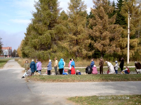 Очередь дачников в ожидании автобуса в Ключи. Вдали видно здание Администрации Советского района.