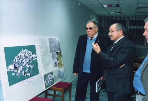 Н.Л. Добрецов, Г.А. Сапожников, Ю.Л. Ершов обсуждают перспективный план развития Академгородка и Технопарка.
