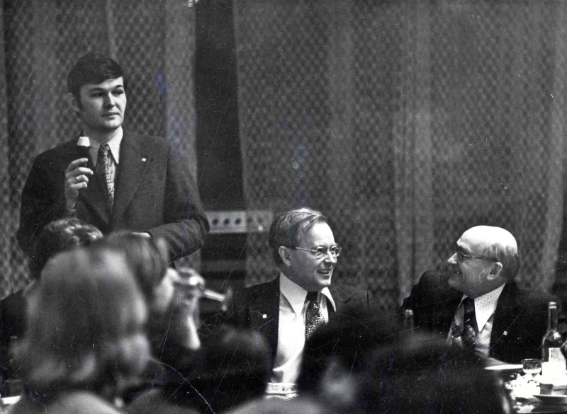 Банкет после семинара "Перспективы развития системного и теоретического программирования"и в честь 20-летия отдела программирования. Сидят в центре А.П. Ершов, М.Р. Шура-Бура. Тост произносит В.Н. Касьянов.