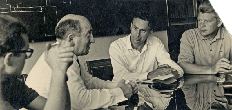 В ИЯФе за круглым столом. Г.И. Будкер (слева) с иностранными гостями.